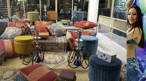 Wij kunnen het waterpijpterras verzorgen in blauwe of aardse kleuren. Begeleider in het zwart of in Arabische kleding.